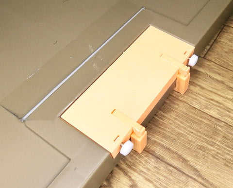部品の裏面にテーブル足の裏側のモールドに合わせて溝を設けたので足の中に取って塞ぎ部品一式を収納できます。