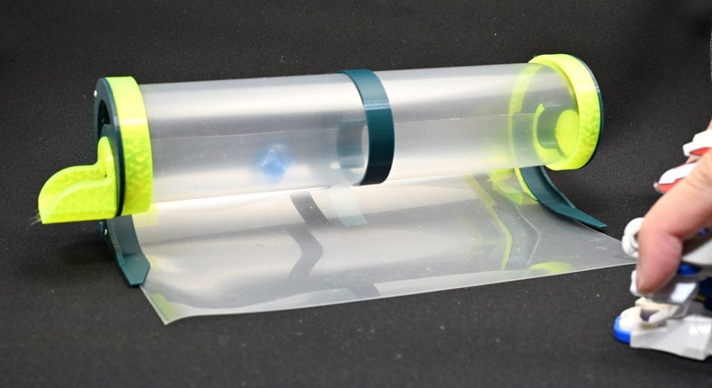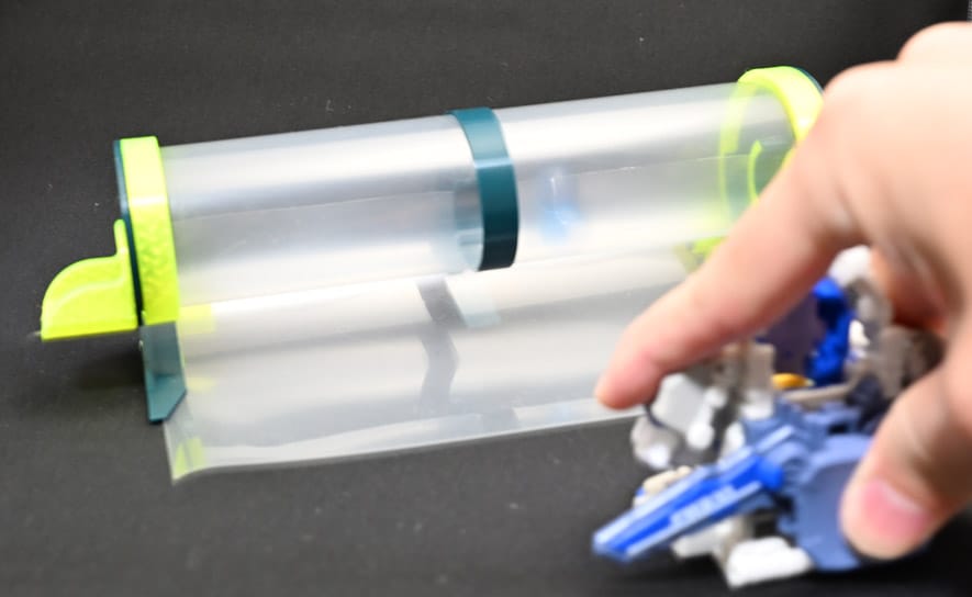 スパイラルビーダマキャッチャーに撃ち込まれたビー玉は、螺旋の中で回転しながら減速し、勢いを抑えてキャッチされ、ゆっくりと横から排出される。
